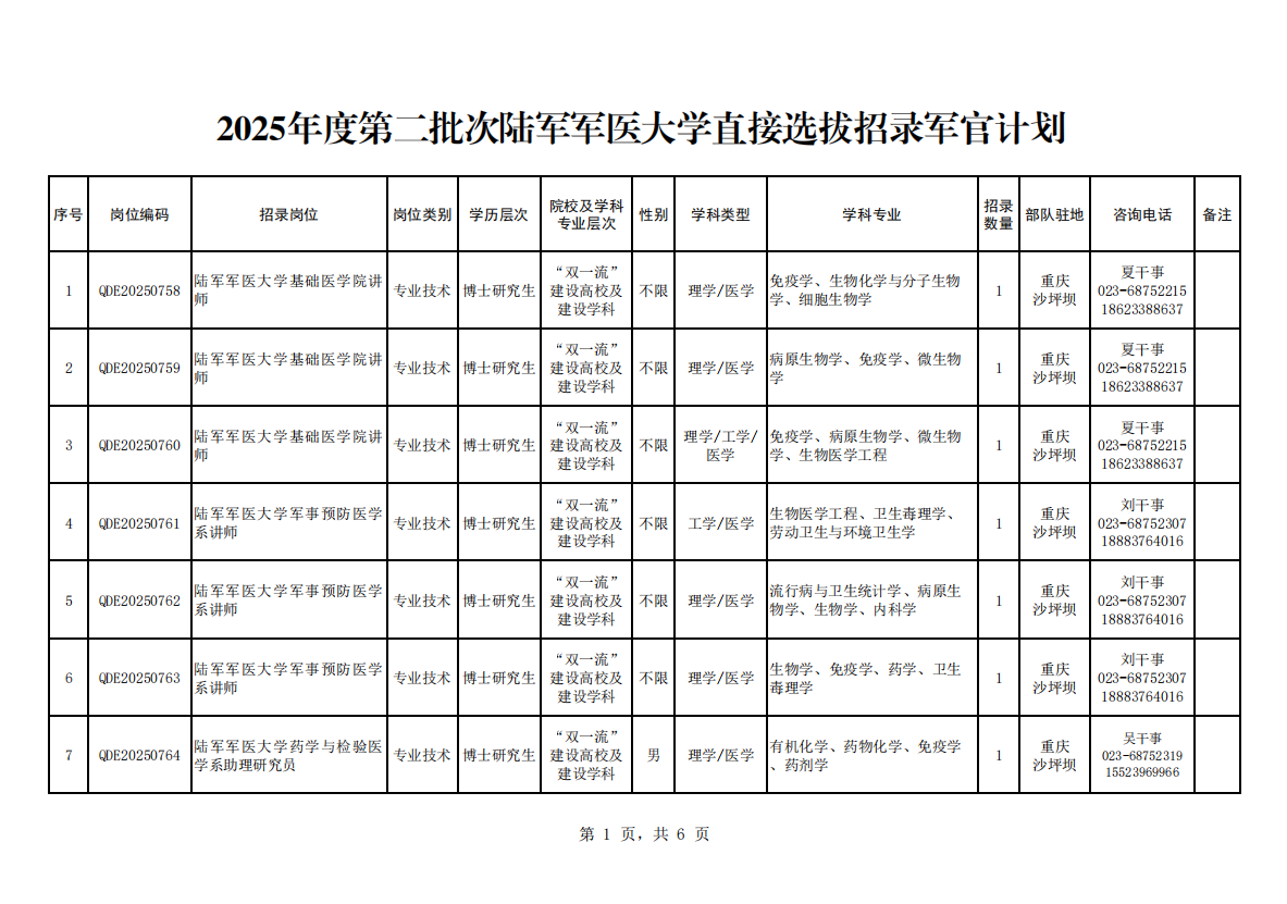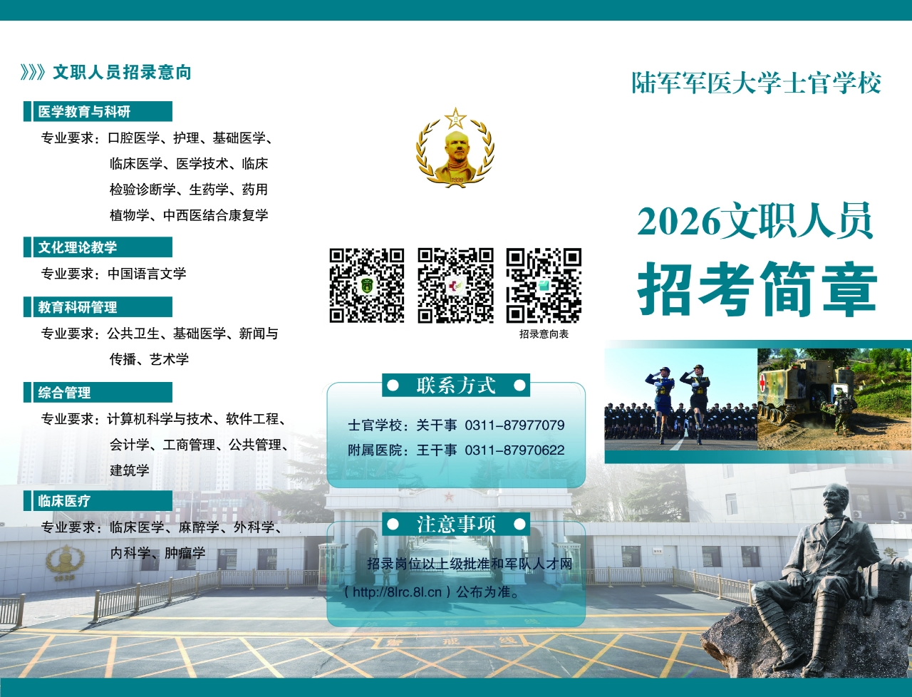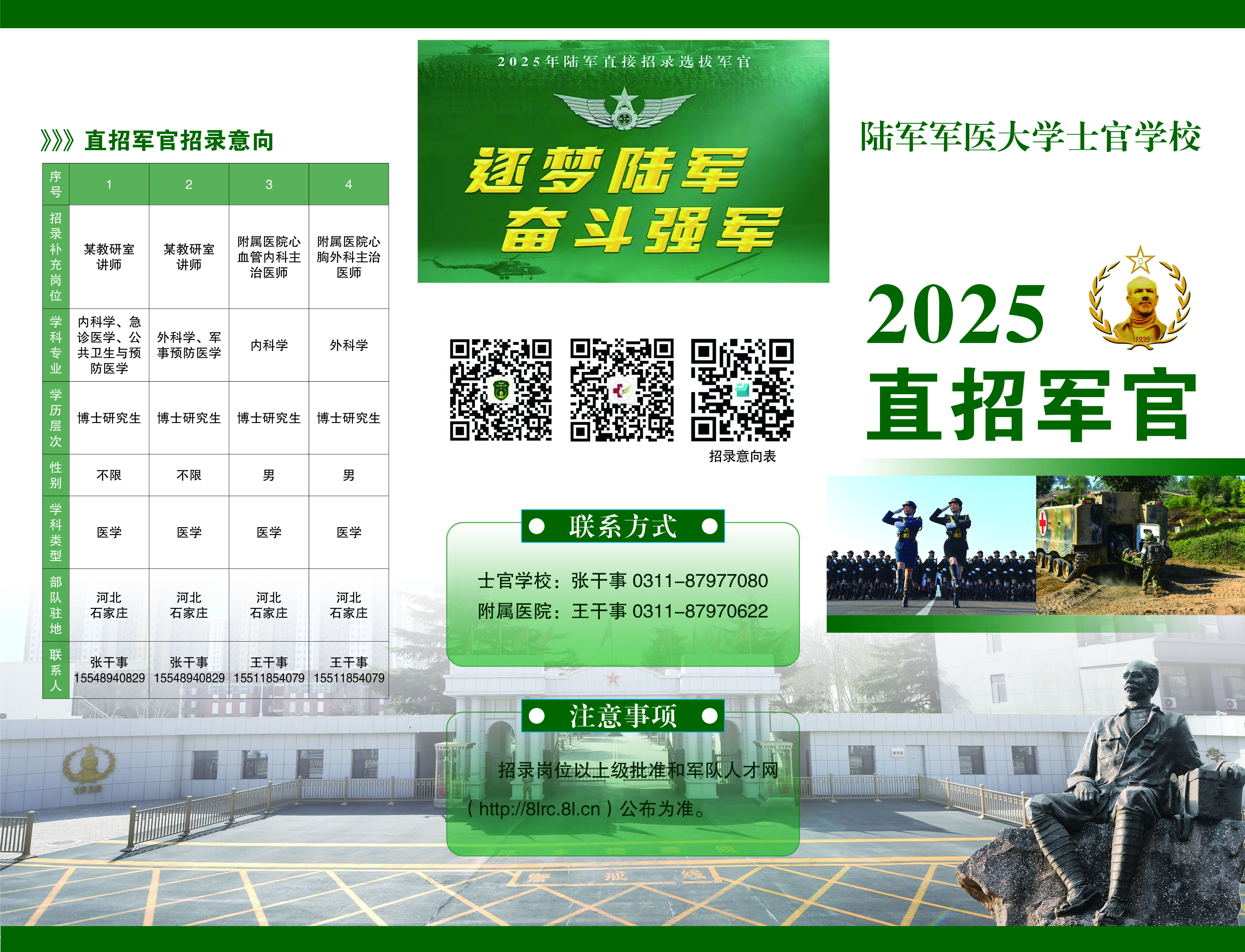 陆军军医大学士官学校将于2025年9月18日来山东大学趵突泉校区开展招聘宣讲活动,感兴趣的同学可以扫描下方二维码进群咨询了解,相关招聘岗位计划附后。