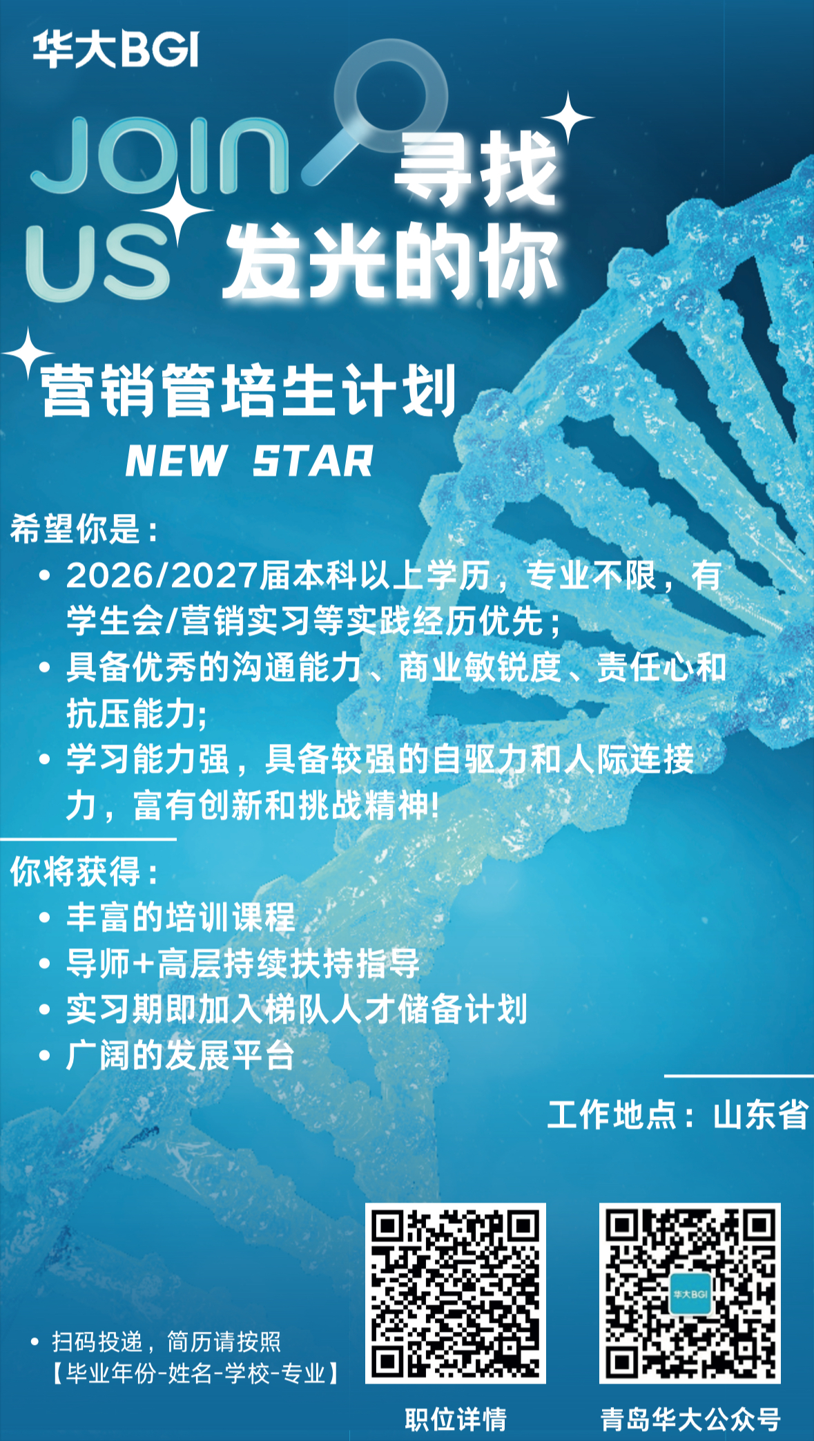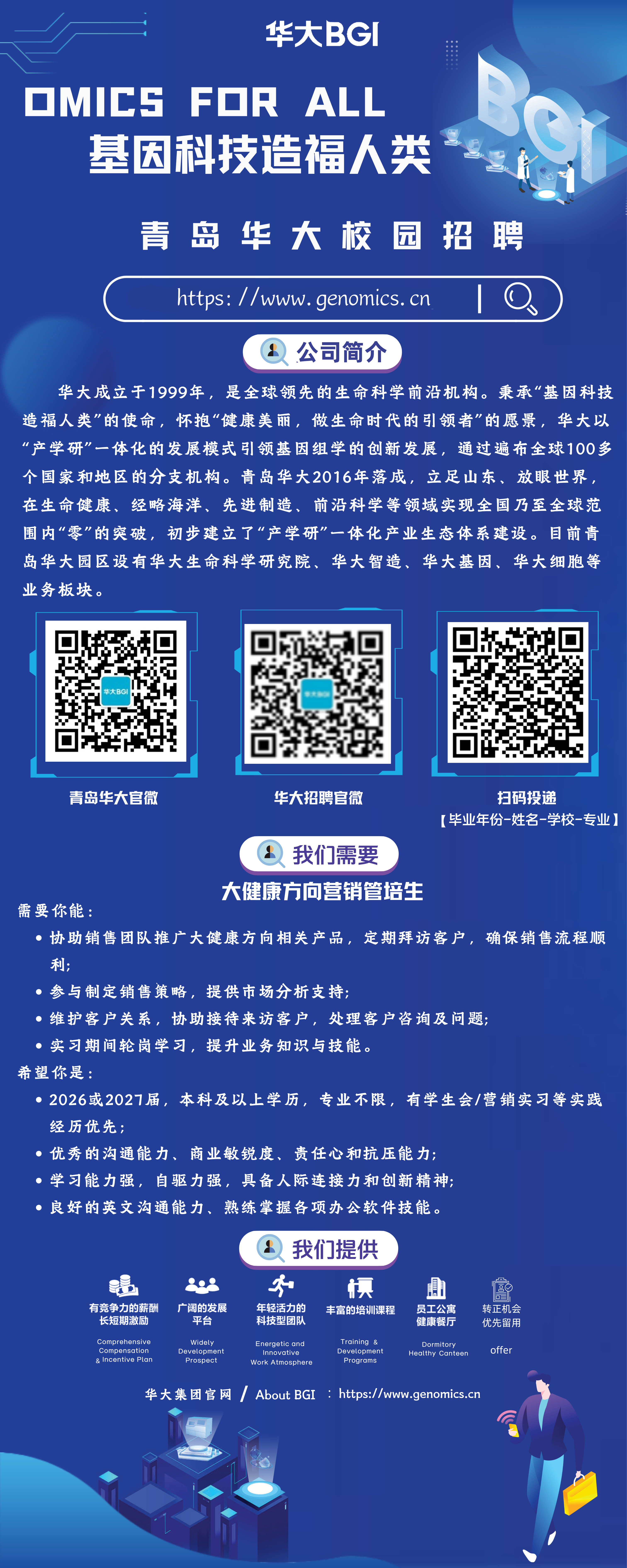 青岛华大基因研究院将于2025年9月29日(周一)上午10:30-12:00在中心校区歌尔报告厅(就业中心第一报告厅)举办招聘宣讲会,感兴趣的同学可以查看相关海报材料,到现场咨询了解。